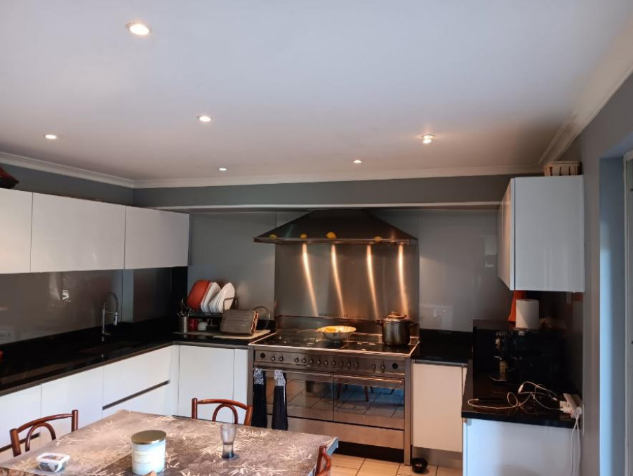 Elle se compose au rez de chaussée d'un grand séjour cathédrale , bien lumineux , d'une magnifique grande cuisine moderne neuve avec un grand piano de cuisson , une chambre froide , un cellier , une salle d'eau et un WC .