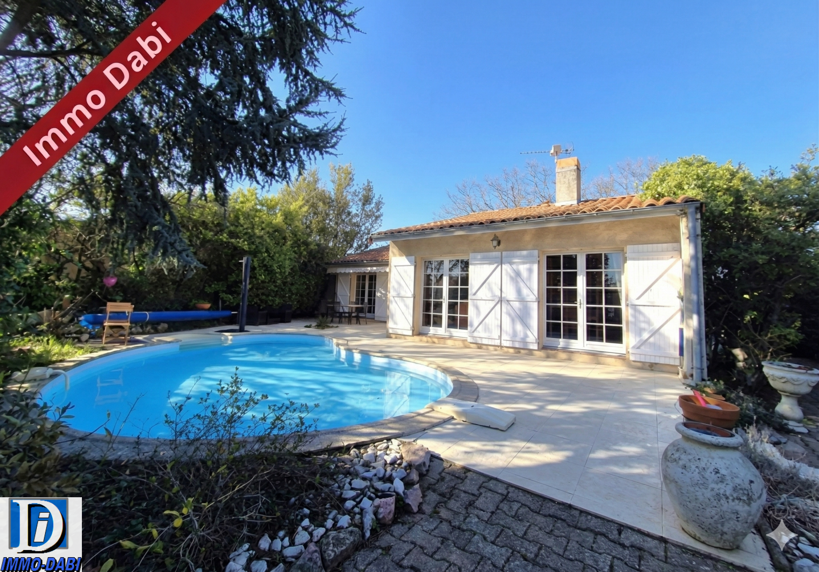 Le jardin cocooning est joliment arboré et végétalisé, avec son joli coin piscine sans vis à vis .