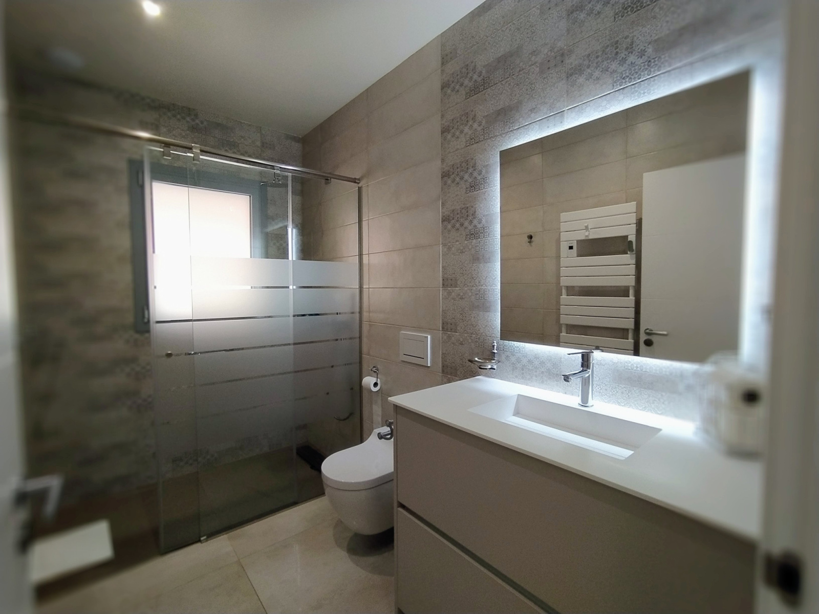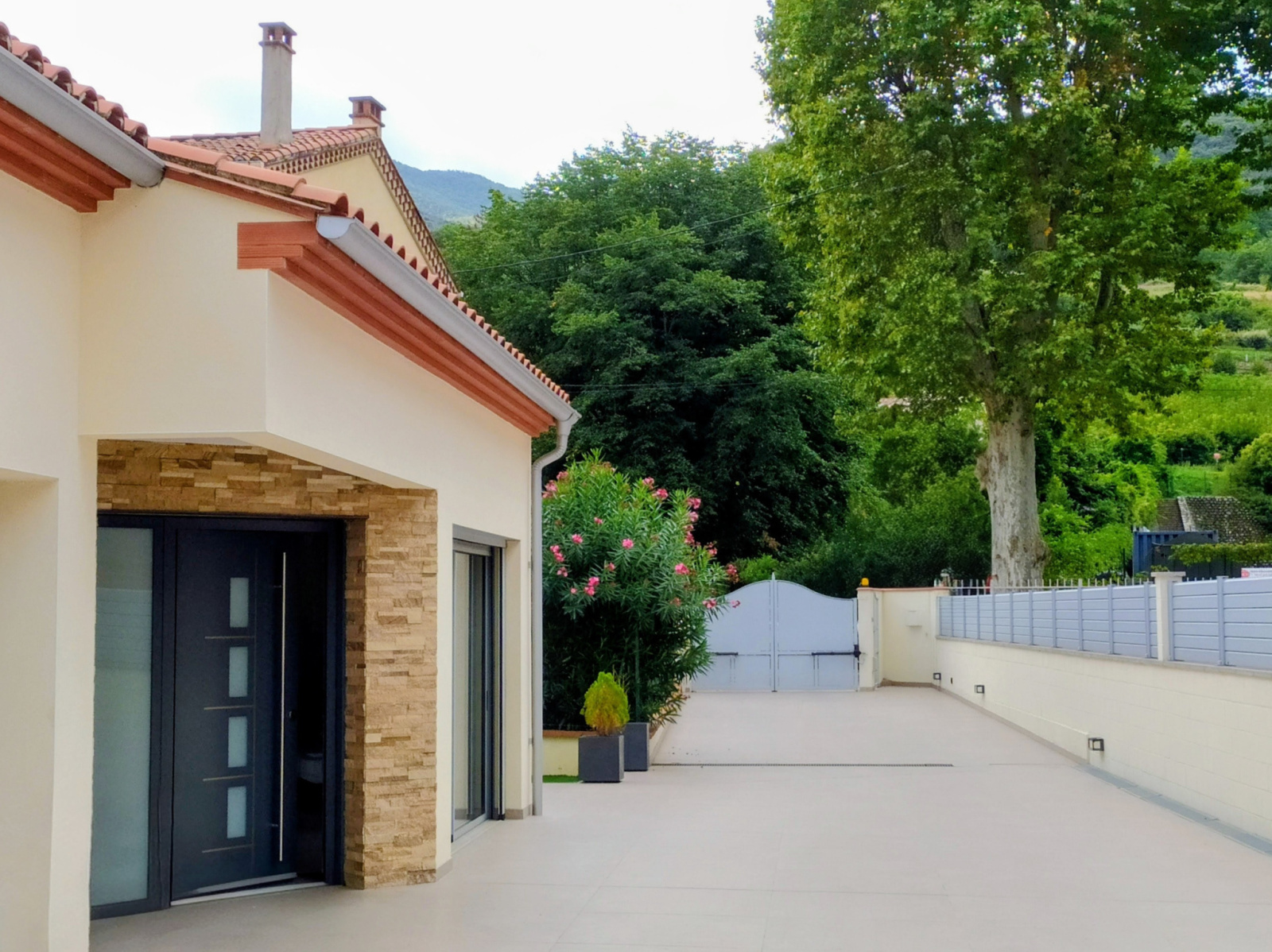 Eric vous présente à CERET(66), haut lieu de la Catalogne au pied du Canigou, dans une région bénéficiant d'un grand ensoleillement, une Villa d'architecte de plain-pied à l'état du neuf, achevée en 2022, aux dernières normes, et de classe énergétique A. Construction et aménagement intérieur de très grande qualité. Proximité immédiate du centre-ville. Parcelle de 600m2 et 137m2 habitables. Logement de conception originale, très lumineux avec de vastes pièces, et d'un standing élevé. Aucun seuil au niveau des portes et portes fenêtres. Ce bien est adapté PMR (Personne à Mobilité Réduite). Aucun travaux à prévoir. Environnement très calme. La parcelle est au ¾ ceinte de murs, et pour le reste par un grillage sur muret avec haies. Elle se trouve en retrait par rapport à l'avenue. Depuis cette dernière on accède par un portail et portillon métalliques électriques avec interphone et visiophone, débouchant sur une longue allée menant à la maison. Une belle et originale entrée en pierres de parement, munie d'une porte anti effraction, ouvre sur une vaste séjour de 35m2. En continuité se trouve la cuisine de 15m2 aménagée sur mesure par un menuisier et totalement équipée : Electroménager très haut de gamme marque NEFF, hotte wifi, four avec porte rétractable, chauffe plat, micro-onde, plaque grand format à induction, lave-vaisselle, emplacement frigo Américain, 2 étagères rétractables pour robot, cafetière par exemple, emplacement pour cave à vin. La cuisine peut être ouverte sur le séjour ou bien fermée, au moyen de 2 grands panneaux coulissant en verre décoré. Elle donne sur un Patio carrelé et couvert, rafraà®chi par un ventilateur de plafond professionnel, et fermé par de solides moustiquaires roulantes électriques semi-occultantes. La cuisine jouxte également une buanderie avec placards, évier lavoir, réservations pour machine à laver et sèche-linge, le tout éclairé par un magnifique vitrail en verres colorés donnant sur le jardin intérieur. Ce jardin paysagé articule le séjour et l'espace nuit. Il est surmonté d'un grand puits de lumière modulable par un Velux piloté. Le jardin intérieur repose sur un bac étanche avec écoulement de l'eau, il est muni d'éclairages étanches au sol. L'espace nuit est composé : D'une salle d'eau de 6m2 entièrement carrelée sol et murs avec douche à l'Italienne, Wc Japonais et radiateur sèche serviette . D'une chambre de 12m2 avec grands placards donnant sur la terrasse par une fenêtre. D'une suite parentale de 28m2 incluant une salle de bain de 8m2 entièrement carrelée sol et murs avec baignoire Balnéo, Wc Japonais, double lavabo et radiateur sèche serviette, la suite parentale comporte un grand dressing avec étagères et tiroirs, et donne sur la terrasse par une porte fenêtre coulissante à galandage. Le garage de 20 m2, communiquant de plain-pied avec la maison, est muni d'une porte sectionnelle motorisée de 3m50. Il s'ouvre également sur la terrasse par une porte fenêtre, il bénéficie d'une borne de recharge pour véhicule électrique. Une 3ème chambre de 10m2, isolée, chauffée et climatisée, se trouve en mezzanine au-dessus du garage. Elle peut servir de chambre, d'espace bureau notamment pour le télétravail, ou d'un espace professionnel avec accès séparé de l'entrée principale de la maison. Tout le tour de la maison est constitué d'une terrasse carrelée en Grès Céram, et un espace jardin se trouve au droit du Patio couvert. Trois points d'eau sont disposés à l'extérieur, ainsi que plusieurs regards d'accès au canal d'arrosage communal enfoui sous la parcelle. Un emplacement extérieur de 12 m2 environ, également carrelé, permet de recevoir par exemple un chalet de jardin, une pergola ou un jacuzzi (autorisations urbanisme validées) avec arrivées eau et électricité existantes. Stationnement intérieur permettant 4 véhicules hors garage. La villa est entièrement domotisée pour les volets roulants, le système de chauffage, l'éclairage extérieur et l'alarme anti intrusion. Le logement est raccordé à la Fibre avec prise de connexion dans toutes les pièces. Toutes les menuiseries sont en Aluminium avec rupture de pont thermique, double vitrage à isolation renforcée et lame d'Argon. Toutes les fenêtres et portes fenêtre sont équipées de moustiquaires coulissantes intégrées. Volets roulants électriques en Aluminium isolé. Protection solaire collée sur vitrages des baies vitrées (séjour, cuisine, suite parentale) Villa entièrement carrelée au sol en Grès Céram (garage et Patio compris) et aux murs des salles d'eau, par des matériaux haut de gamme et avec une haute qualité de finition. Fondations isolée, murs en briques avec isolation intérieure par doublage Styrodur 10cm. Plafonds isolés. Charpente en fermettes métalliques avec isolation polyuréthane de 8cm projetée en sous pente de la toiture. Vmc dans toutes les pièces humides. Chauffage/refroidissement par pompe à chaleur gainable air/air. Eau chaude par cumulus électrique thermodynamique 200 litres. Garanties décennales en cours de validité sur gros oeuvre, second oeuvre, installation électrique, installation de chauffage et climatisation. Proximité immédiate commerces, Crèches, Ecoles, Collège et Lycée. Lignes de bus à proximité pour accès communes voisines, communes du littoral et gare SNCF de PERPIGNAN. Aéroport de PERPIGNAN à 35mn en voiture. Pistes de ski de FONT-ROMEU à 80km. Couverture réseaux : 4G/5G et logement raccordé Fibre Honoraires à la charge du vendeur. Etiquette énergétique A : 34 Kwh/m2/an d'énergie primaire, et 14 Kwh/m2/an d'énergie finale. Etiquette émission GES (Gaz à effet de serre) A : 1 kgeqCO2/m2/an Montant estimé des dépenses annuelles d'énergie pour un usage standard : entre 430 € et 650 € sur les années 2021, 2022 et 2023 (abonnements compris). Les informations sur les risques auxquels ce bie