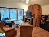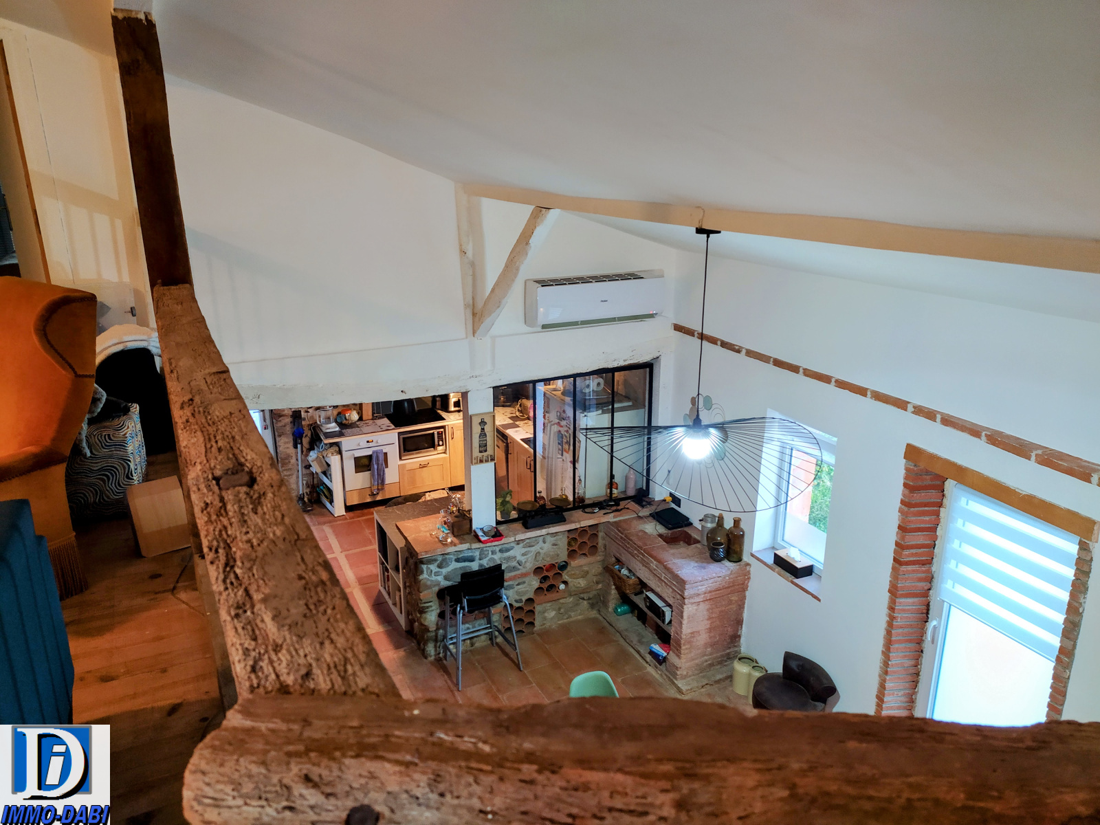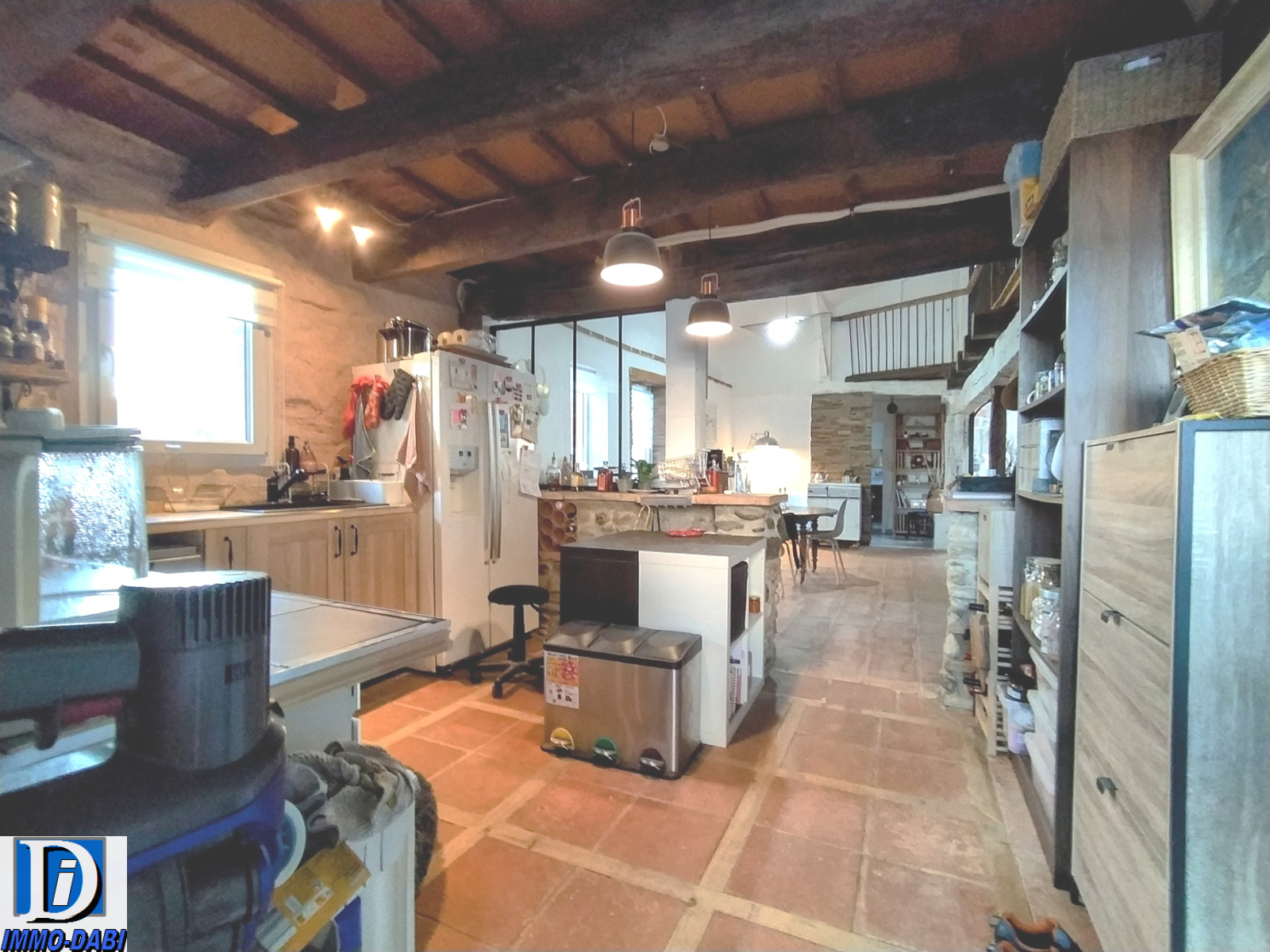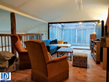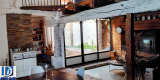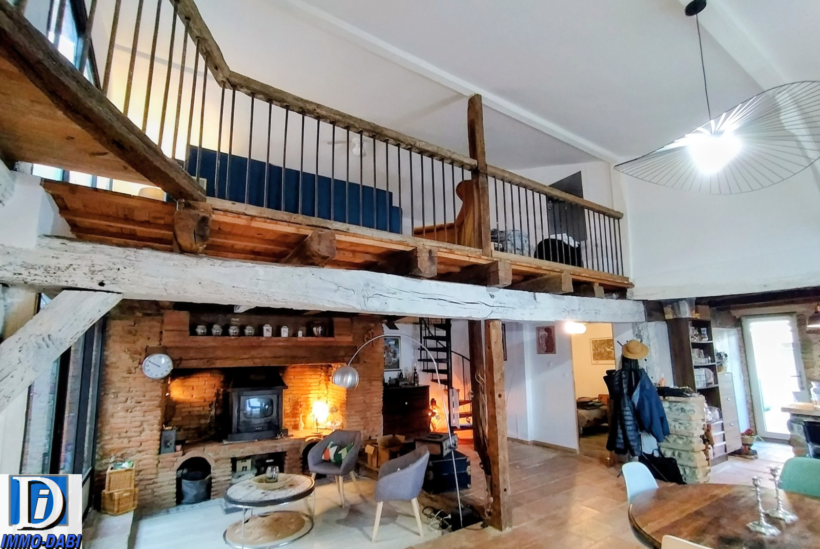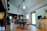 Une cuisine de 13 m2 entièrement équipée (avec en plus de la plaque à induction une cuisinière traditionnelle au bois fonctionnelle) donnant sur un séjour de 42 m2 avec mezzanine de 22 m2 tous deux sous charpente apparente et agrémentés d’une grande cheminée en briques foraines.
