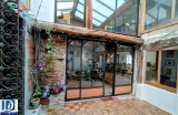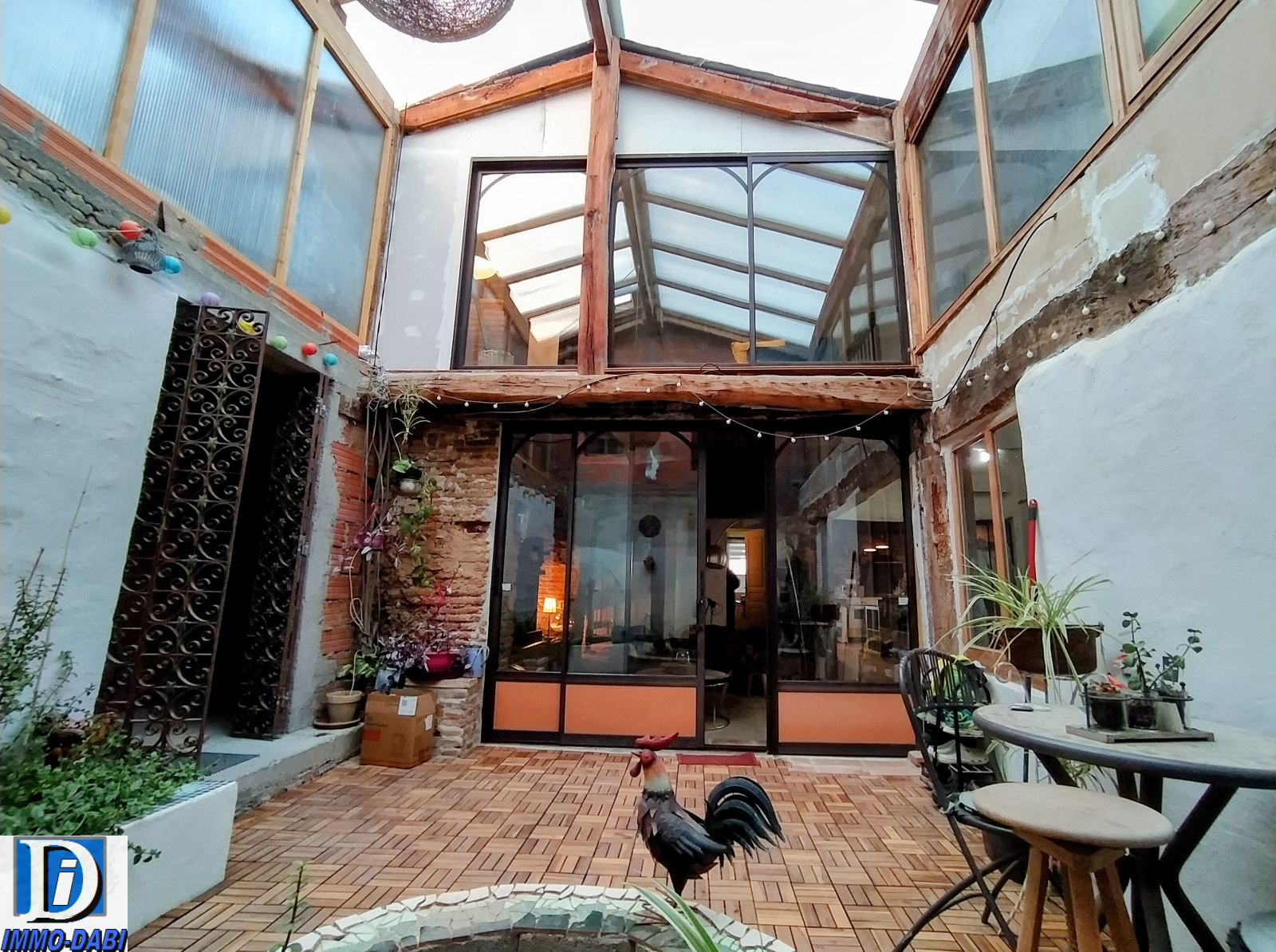 Un grand patio lumineux de 19 m2 avec un puits en son centre, couvert par la charpente et des panneaux transparents en polycarbonate isolé.